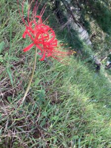 それもそのはず。清掃活動中に生い茂る緑の中に咲く彼岸花を見かけました。