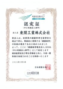 「健康経営優良法人2026」認証 公開済み: 2026年4月7日更新: 2026年4月7日作成者: hi.kannoカテゴリー: ニュース この度、東開工業株式会社(本社 福島県福島市・代表取締役 髙野次郎)は、 日本健康会議が認める「健康経営優良法人2026」(中小規模法人部門)認証を得ました。 身体が資本の製造業の当社において 社員の健康が社業をより発展させるために何より必要不可欠と考えます。 本認証を通して、社員に健康の保持増進を大切にしてほしいもの・ぜひ実践してほしいものとして 引き続き周知を進めるとともに取り組みやすい環境の整備を実施してまいりたい所存です。